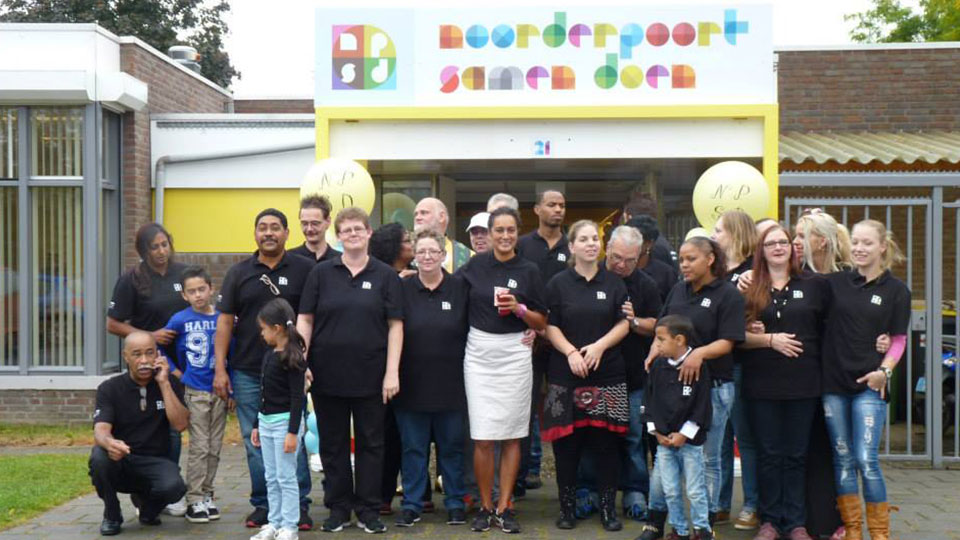 (Op de foto een groep vrijwilligers van Noorderpoort. Let vooral op de meneer linksonder. Allemaal best, dat er zo nodig een foto gemaakt moet worden – maar het werk gaat door en dus wordt er driftig getelefoneerd. De kinderen kijken kritisch toe.)