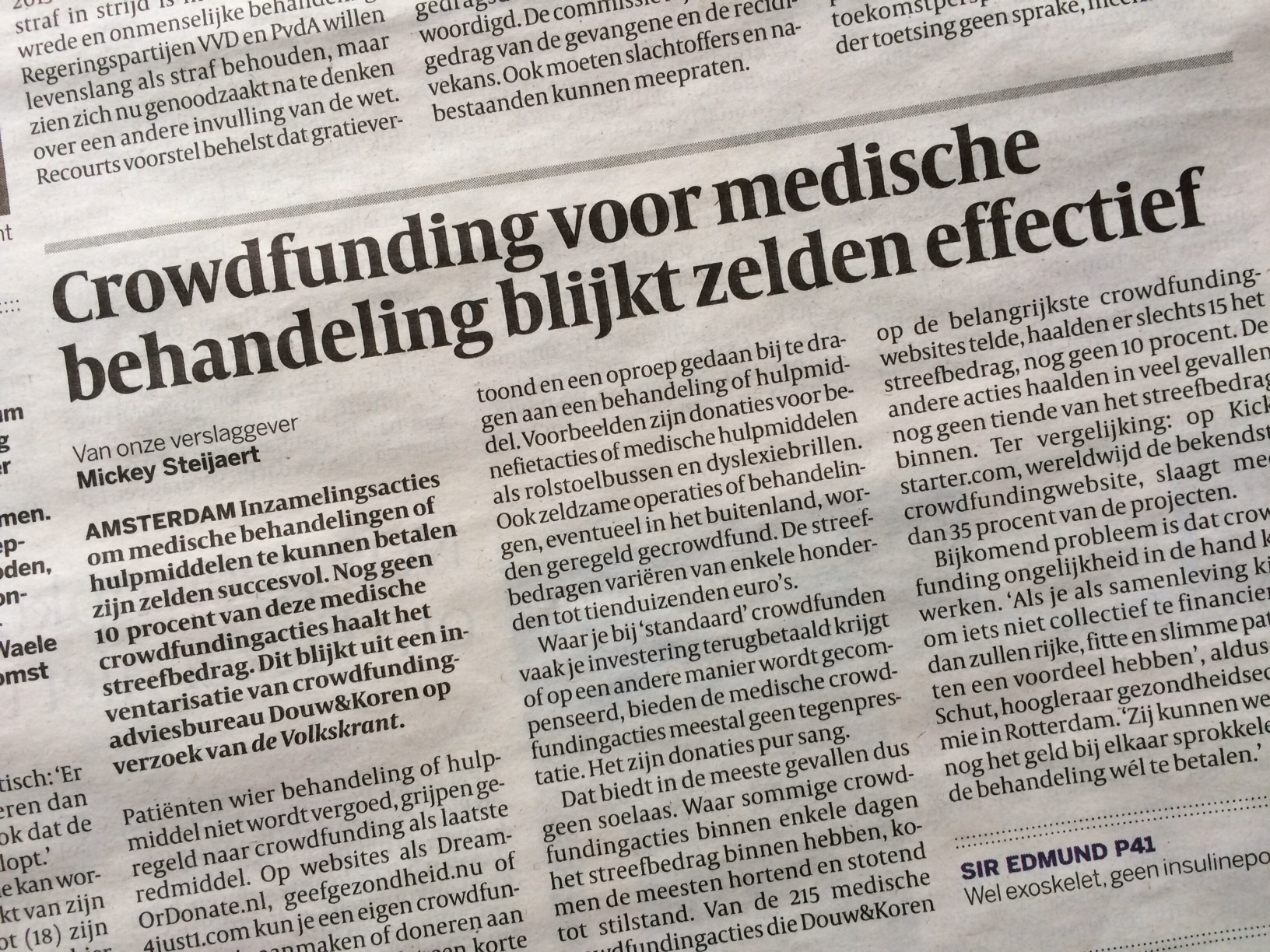 Probeer maar eens via crowdfunding geld in te zamelen voor een dure medische operatie die de verzekering vertikt om te vergoeden. De kans dat het lukt, is pakweg 10 procent. Dat schrijft de Volkskrant vandaag. Bij Sprinkels hq worden we er een beetje trots van. Wij weten namelijk wél hoe je zoiets aanpakt.